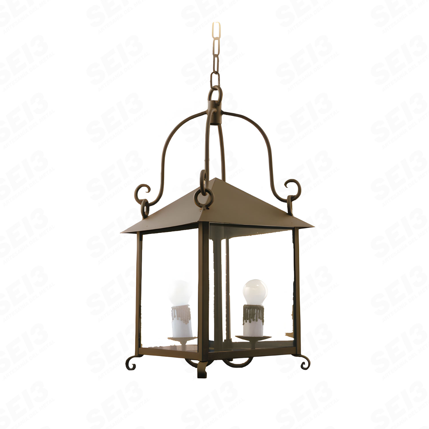 Esta diseñado para el exterior o interior de nuestro hogar, lleva dos luces con portalámparas E27 orientada hacia arriba, incorpora una funda vela, cadena y florón para el enganche en el techo. Su forma cuadrado con adornos forjados en la parte de abajo como en la de arriba con un tejado lo hacen único a este modelo.